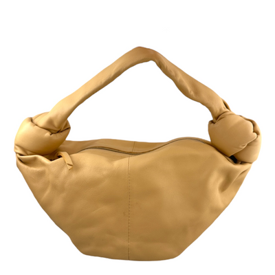 Bottega Veneta Double Knot Handbag. Single top handle strap. Zipper losure. Hobo style, slouchy silhouette. In good pre-owned condition, a few faint marks/blemishes on the leather. Includes the duster. Height 4.5", width 12", depth 4".