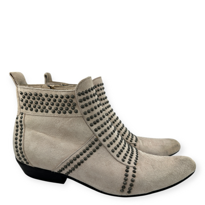 Anine Bing Suede Studded Boots. Blush suede with silver-tone studs. Pointed-toe with embroidery. Short heel. Zipper closure. In good pre-owned condition, shows some scuffs and wear.