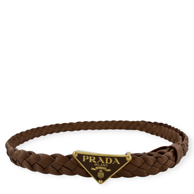 Prada Triangle Logo Braided Belt. Brown leather. Gold-tone hardware. Push-pin closure. Length is adjustable. In excellent pre-owned condition, no flaws. Length 48".