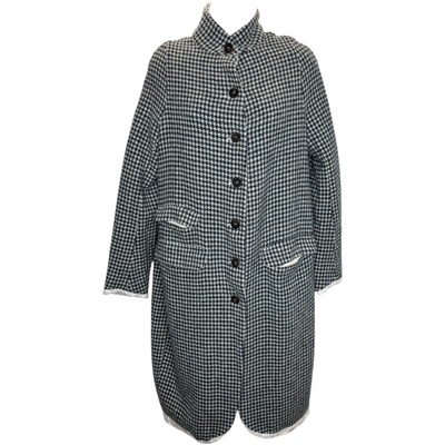 Hannoh Wessel Carine Coat. Long sleeves. Stand collar. Front button closure. Flap pockets. Navy houndstoot. Cotton lining. Pinstripe trim. Ankle length. Harris tweed. Wool. Size small. In excellent pre-owned condition, no flaws. B38", L40".
