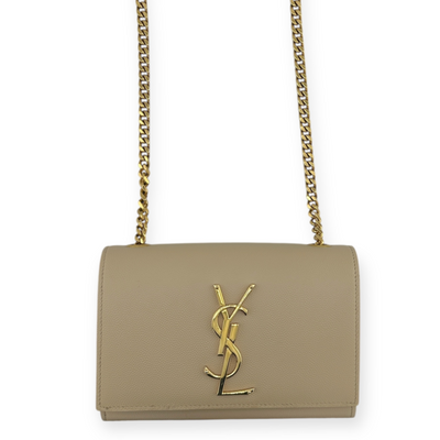 Saint Laurent Mini Kate Bag. Grained beige leather. Gold-tone chain shoulder strap. YSL hardware logo. Magnet closure. Single side pocket at lining. In excellent pre-owned condition, very minimal wear. Height 5", width 7", depth 2".