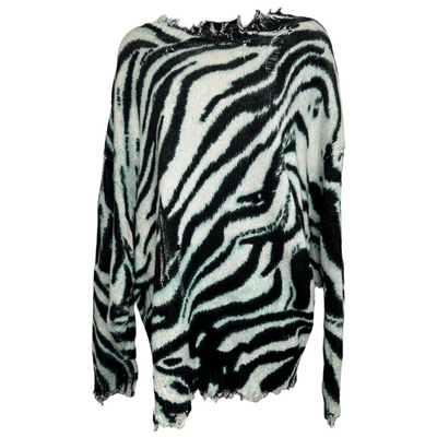 R13 Printed Oversized Sweater. Cotton. Black, white, and mint print. Intentionally distressed. In excellent pre-owned condition, no flaws. Length 30", bust 46".