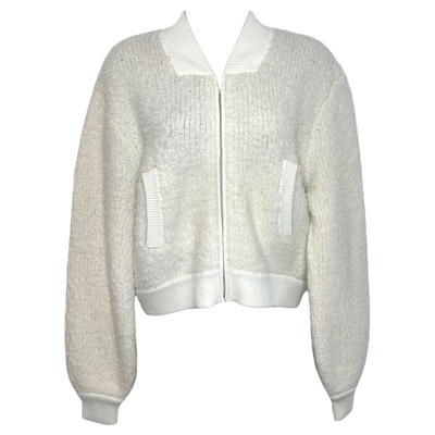 Sablyn Cala Shrunken Sherpa Bomber Jacket. Cashmere, cotton, polyamid, silk blend. Zip at front. Welt front pockets. Crew neck. In excellent pre-owned condition, light wear. Boucle fabric. Length 21", bust 40".