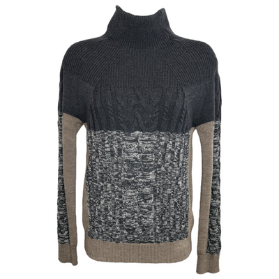 Etro Cable-knit Turtleneck Sweater. Long sleeves. Ribbed collar, cuffs, and waist. Grey and tan colorblocking detail. Size medium. 100% wool. In excellent pre-owned condition, no flaws. B34", L24".